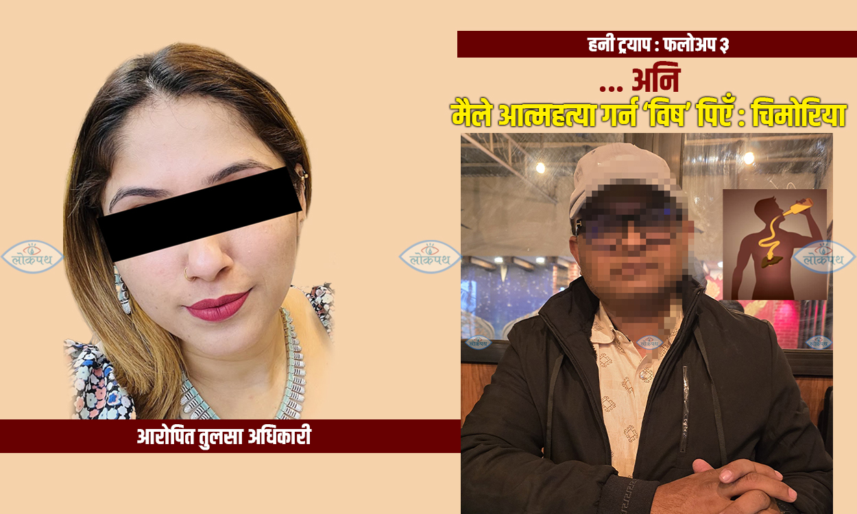 (यो समाचार पीडित भनिएका परिवर्तित नाम शंकर चिमोरियासँग गरिएको कुराकानी र उनले दिएको जाहेरीका आधारमा तयार पारिएको हो । यस सम्बन्धमा तुलसासँग कुराकानी हुँदा उनले अहिले सबै विषयमा नआउने र बोल्नु पर्ने कुराहरू अदालतमै बोल्ने बताइन् । यद्यपि चिमोरियाले भनेका कुराहरूमा केही सत्य, केही अर्ध सत्य र केही शतप्रतिशत झुट भएको उनको आरोप छ ।)