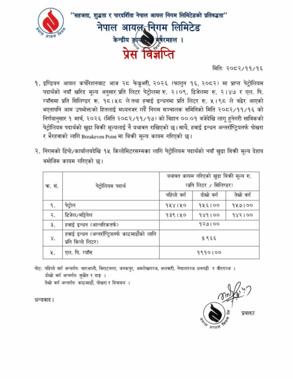 निगमले फागुन १६ गते जारी गरेको प्रेस विज्ञप्तिअनुसार इण्डियन आयल कर्पोरेसनबाट सोही दिन प्राप्त नयाँ खरिद मूल्यसूचीअनुसार पेट्रोलमा प्रतिलिटर रु २.१०, डिजेलमा रु २.४७ र एलपी ग्यासमा प्रति सिलिन्डर रु १८.५८ ले वृद्धि भएको छ । साथै, हवाई इन्धनमा प्रतिलिटर रु ५.१८ ले मूल्य बढेर आएको उल्लेख गरिएको छ ।