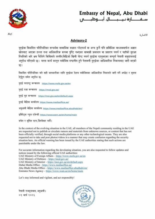 काठमाडौं । अबुधाबीस्थित नेपाली राजदूतावासले युएईमा भइरहेको घटनासँग सम्बन्धित कुनै पनि पुष्टि नभएको भिडियो वा तस्बिर सामाजिक सञ्जालमा सार्वजनिक नगर्न आग्रह गरेको छ ।
