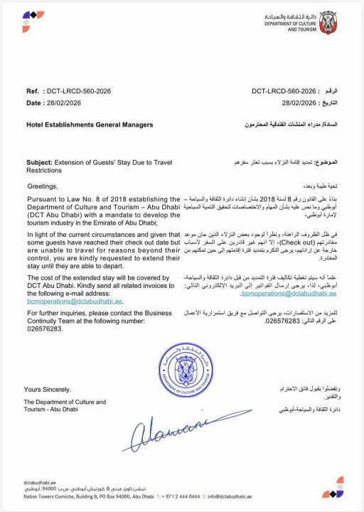 विभागले ५ दिनअघि नै निर्णय गरिएको एक परिपत्र जारी गर्दै, आबुधावी क्षेत्रमा काबु बाहिरको परिस्थिति परिस्थितिले गर्दा आफ्नो देश फर्कन नसकेका र भिसा वा होटलको चेक–आउट मिति सकिएका पाहुनाहरूको बसाइ अवधि लम्ब्याउन त्यहाँका सबै होटलहरूलाई निर्देशन दिएको छ ।