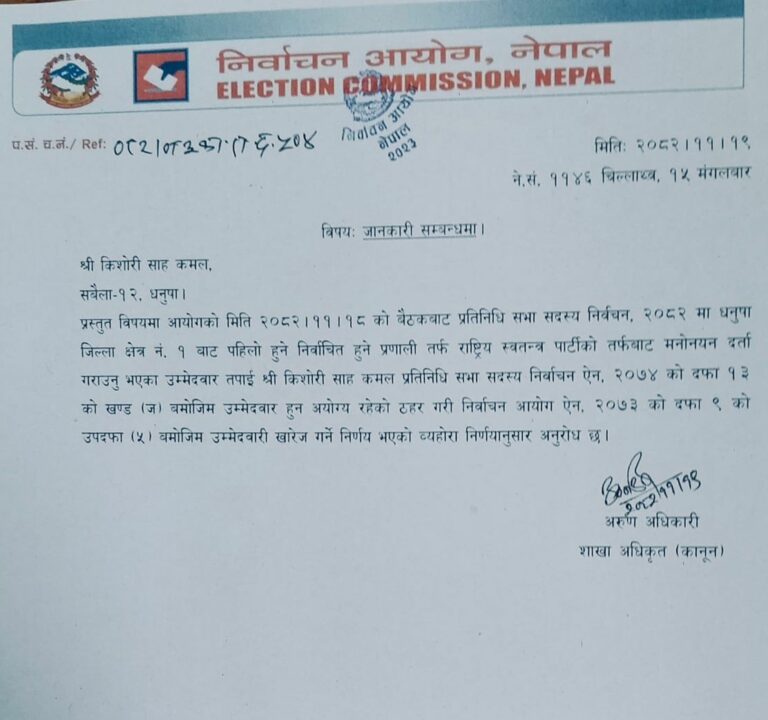 काठमाडौं । धनुषा क्षेत्र नं १ का राष्ट्रिय स्वतन्त्र पार्टी (रास्वपा) का उम्मेदवार किशोरी साह कमलको उम्मेदवारी खारेज भएको छ ।