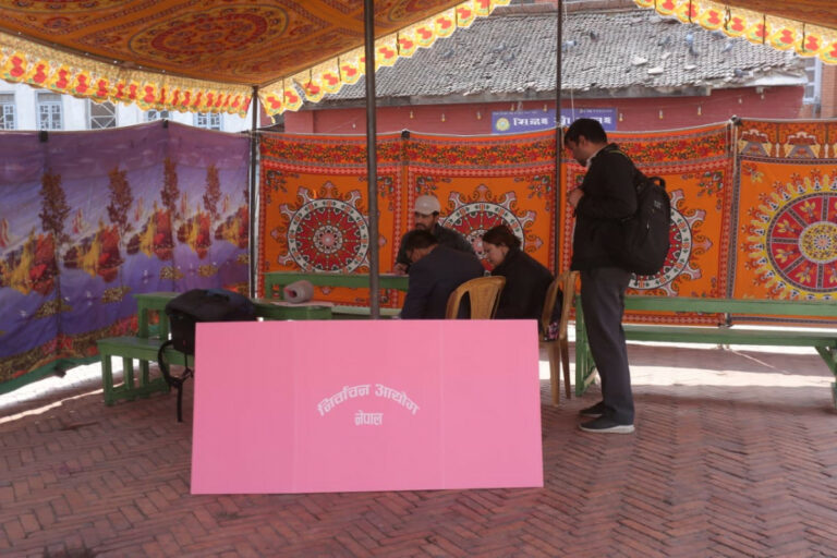 ‘निर्वाचन आयोग नेपाल’ लेखिएका गुलाफी रङका मतपेटिकाहरूलाई गोप्य मतदानका लागि सुरक्षित रूपमा टेबलमा राख्ने अभ्यास भइरहेको छ । सेता बोराहरूमा प्याक गरिएका संवेदनशील निर्वाचन सामग्रीहरू मतदान केन्द्रमा पुगिसकेका छन् र सुरक्षित राखिएका छन् ।