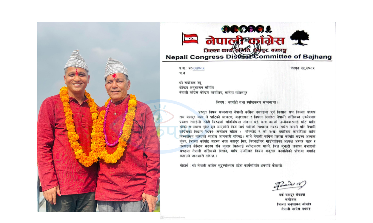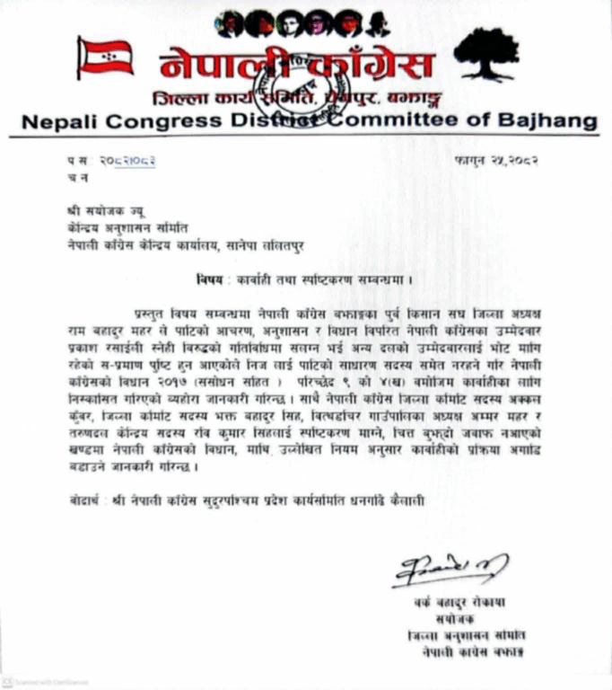 ‘नेपाली कांग्रेस बझाङका पूर्वकिसान संघका जिल्ला अध्यक्ष रामबहादुर महरले पार्टीको आचरण, अनुशासन र विधान विपरित नेपाली कांग्रेसका उम्मेदवार प्रकाश रसाईली स्नेहीविरुद्धको गतिविधिमा संलग्न भई अन्य दलको उम्मेदवारलाई भोट मागिरहेको सप्रमाण पुष्टि हुन आएकाले निजलाई पार्टीको साधारण सदस्य समेत नरहने गरी नेपाली कांग्रेसको विधान २०१७ (संशोधन) सहित परिच्छेद ९ को (ख) बमोजिम कारबाहीका लागि निष्काशित गरिएको व्यहोरा जानकारी गरिन्छ,’ जिल्ला अनुशासन समितिका संयोजक वर्कबहादुर रोकायाले जारी गरेको विज्ञप्तिमा भनिएको छ । त्यस्तै अन्य केही व्यक्तिहरुलाई संकास्पद गतिविधि गरेको भन्दै स्पष्टीकरण सोधिएको छ ।