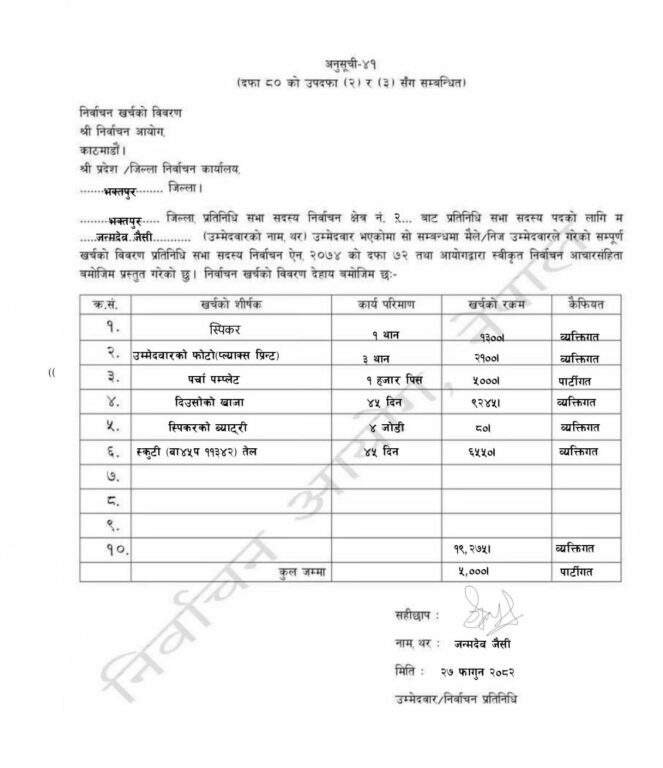 उनका अनुसार स्पिकरको भाडा १३ सय र त्यसलाई ब्याट्री ८० रुपैयाँको लागेको बताएका छन् । त्यस्तै उम्मेदवारको फोटो (फ्ल्याक्स प्रिन्ट) ३ थानको २१ सय रुपैयाँ लागेको खर्च विवरणमा उल्लेख गरेका छन् । त्यस्तै निर्वाचनको अवधिभर ४५ दिनमा उनले स्कुटरका लागि ६ हजार ५ सय ५० रुपैयाँको पेट्रोल हालेको बताएका छन् ।
