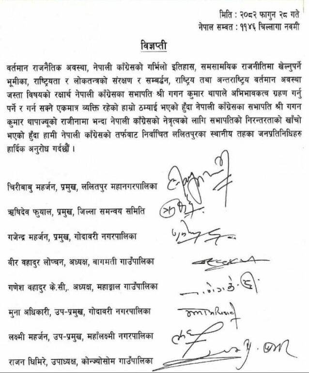 काठमाडौं । ललितपुर जिल्लाबाट स्थानीय तहमा नेपाली कांग्रेसबाट निर्वाचित जनप्रतिनिधिले सभापति गगनकुमार थापालाई सभापतिबाट राजीनामा नदिन आग्रह गरेका छन् ।