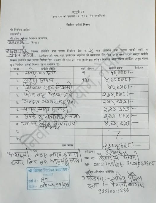 त्यस्तै प्रिटिङ तथा स्टेसनरीका लागि ४७ हजार ९ सय ४० रुपैयाँ रहेको छ । यता फोन तथा मिडिया खर्चका नाममा २ लाख ५५ हजार ७८ रुपैयाँ उल्लेख गरिएको छ । मतदाता भेटघाट तथा सभाका लागि ३ लाख ३९ हजार ९ सय २५ रुपैयाँ, प्रचारप्रसार सामग्रीका लागि ५ लाख ५३ हजार ३ सय ५० रुपैयाँ रहेको छ ।