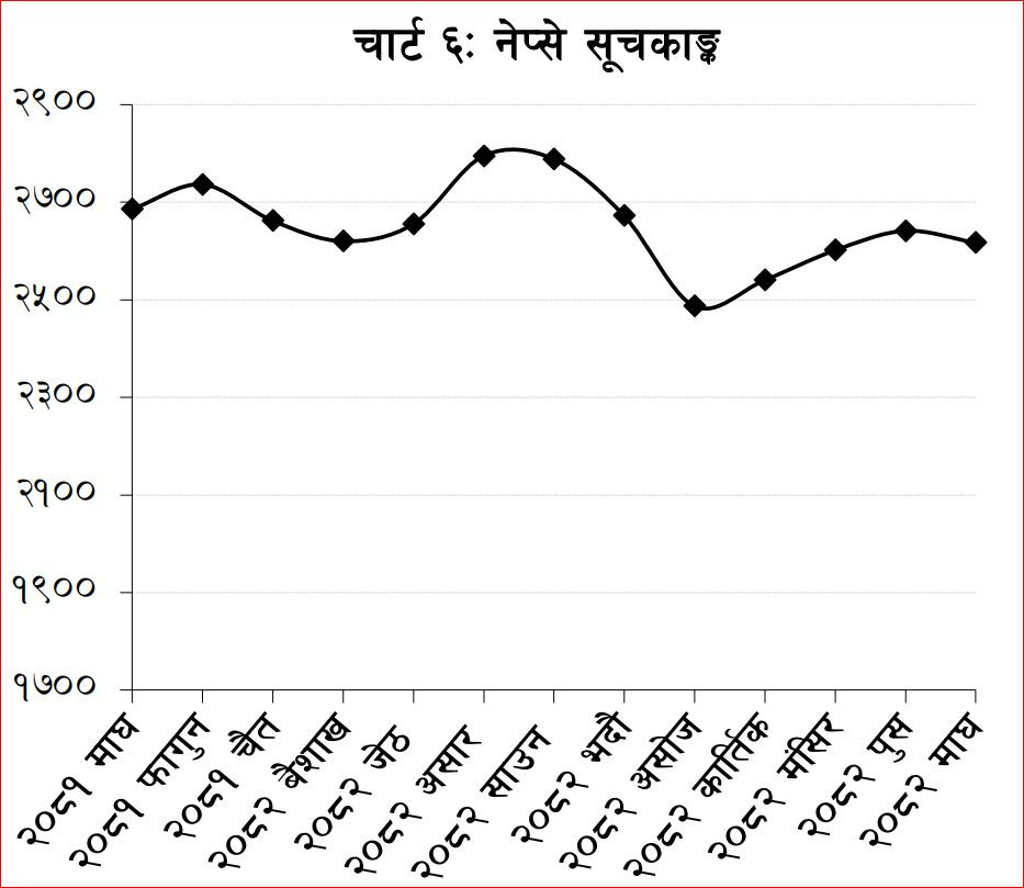 राष्ट्र बैंककाअनुसार ०८१ माघ मसान्तमा २६८५.७३ रहेको नेप्से सूचकांक रहेकोमा ०८२ माघ मसान्तमा २६७१.०७ कायम भएको छ भने नेपाल स्टक एक्सचेन्ज लिमिटेडमा सूचीकृत कम्पनीहरूको सङ्ख्या २८४ रहेको छ । सूचीकृत कम्पनीहरूमध्ये १३२ बैंक तथा वित्तीय संस्था र बीमा कम्पनी रहेका छन् ।