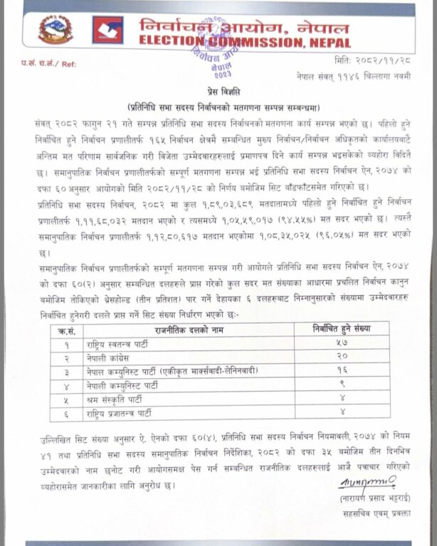 त्यस्तै आयोगले ३ दिनभित्र यसअघि नै आयोगमा बुझाएको समानुपातिकको बन्दसूचीका आधारमा नाम छनोट गरी आयोगमा पेस गर्न समेत भनेको छ । आयोगका अनुसार समानुपातिकमा खसेको कुल सदर मतको ३ प्रतिशत ल्याइ थ्रेसहोल्ड कटाएका राजनीतिक दलहरुले राष्ट्रिय दलको मान्यता पाएका छन् ।