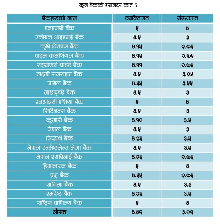 फागुन महिनामा व्यक्तिगतमा ४.५६ र संस्थागतमा ३.३३ प्रतिशत विन्दुमा ब्याजदर थियो । चैत महिनाका लागि भने बैंकहरुको ब्याजदर व्यक्तिगततर्फ ४.४९ प्रतिशत र संस्थागततर्फ ३.२९ प्रतिशत विन्दुमा झरेको छ ।