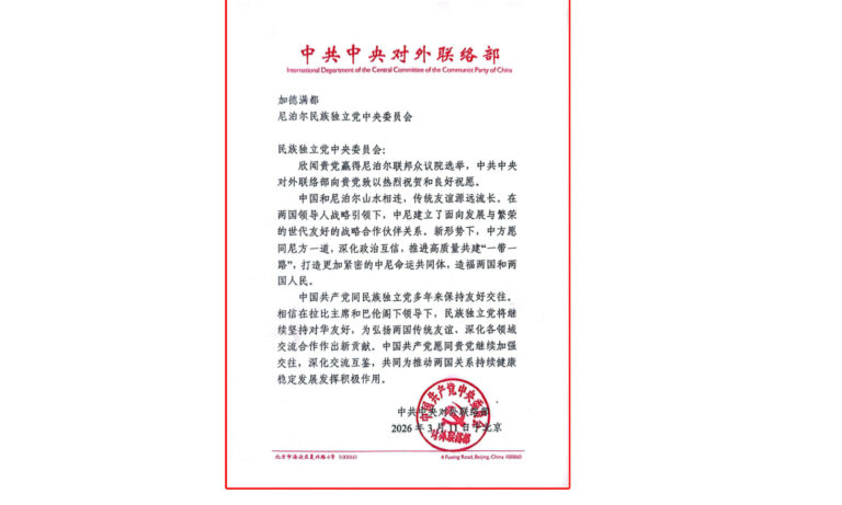 ‘चिनियाँ कम्युनिष्ट पार्टी (सीपीसी) को अन्तर्राष्ट्रिय विभागले हालै राष्ट्रिय स्वतन्त्र पार्टी (रास्वपा) लाई एक औपचारिक पत्र पठाउँदै बधाई तथा आत्मीय शुभकामना व्यक्त गरेको छ । उक्त सन्देशमार्फत चिनियाँ कम्युनिष्ट पार्टीले रास्वपासँगको बढ्दो सम्बन्ध र सहकार्यप्रति खुसी व्यक्त गर्दै आगामी दिनमा दुई राजनीतिक शक्तिबिचको सम्बन्ध अझ प्रगाढ हुने विश्वास दिलाएको छ,’ खनालले भनेका छन् ।