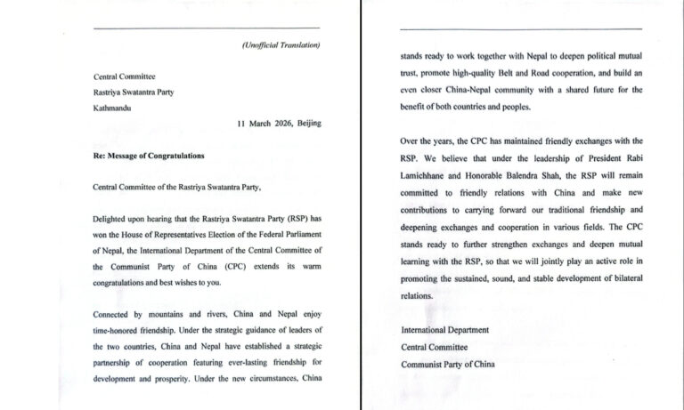काठमाडौं । हालैको निर्वाचनमा झण्डै दुई तिहाई बहुमतको शक्ति प्राप्त गरेको राष्ट्रिय स्वतन्त्र पार्टी (रास्वपा) लाई चिनियाँ कम्युनिष्ट पार्टी (सीपीसी) ले बधाई दिएको छ ।