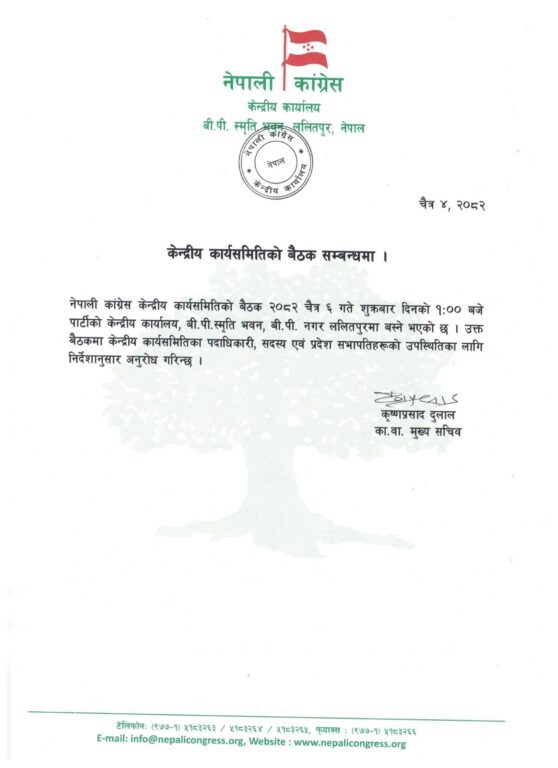 काठमाडौं । नेपाली कांग्रेसले केन्द्रीय कार्यसमितिको बैठक बोलाएको छ ।