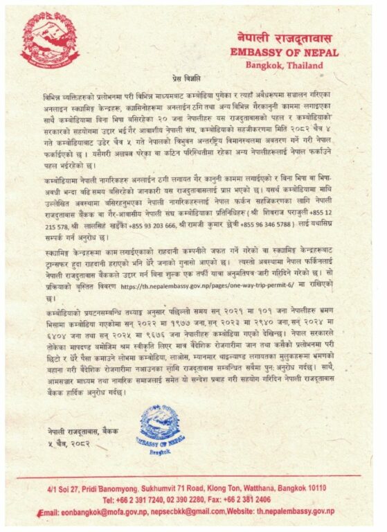 दूतावासका अनुसार कम्बोडियामा अझै अलपत्र परेकाहरू छन् र उनीहरूलाई पनि सुरक्षित फर्काउन पहल भइरहेको छ ।