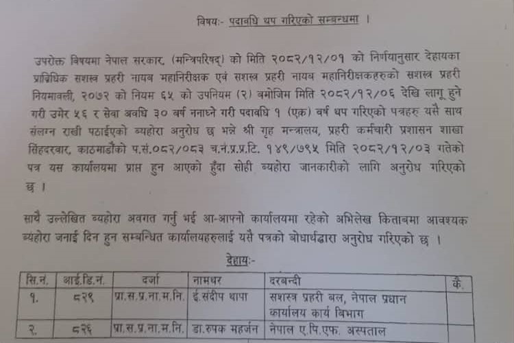 मानवस्रोत विभागका प्रमुख सशस्त्र प्रहरी अतिरिक्त महानिरीक्षक नारायणदत्त पौडेलद्वारा हस्ताक्षरित पत्रमा १ चैतको मन्त्रिपरिषद् बैठकले सशस्त्र प्रहरी नियमावली, २०७२ को नियम ६५ को उपनियम (२) बमोजिम मिति २०८२/१२/०६ देखि लागू हुने गरी उमेर ५६ र सेवा अवधि ३० वर्ष ननाघ्ने गरी पदावधि १ (एक) वर्ष थप गरिएकोसम्बन्धी पत्र गृह मन्त्रालयअन्तर्गतको प्रहरी कर्मचारी प्रशासन शाखाबाट ३ चैतमा प्राप्त भएको भन्दै सोही ब्यहोरा जानकारीका लागि अनुरोध गरिएको उल्लेख छ । सो पत्रको चलानी नम्बर ८०६ रहेको छ ।