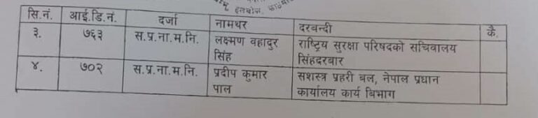 म्याद थप गरिएका सिंह अहिले राष्ट्रिय सुरक्षा परिषद्को सचिवालय र प्रदीप पाल कार्य विभागमा कार्यरत छन् । त्यस्तै, सन्दीप थापा कार्यविभाग र रूपक महर्जन नेपाल एपीएफ अस्पताल, बलम्बुमा कार्यरत छन् ।