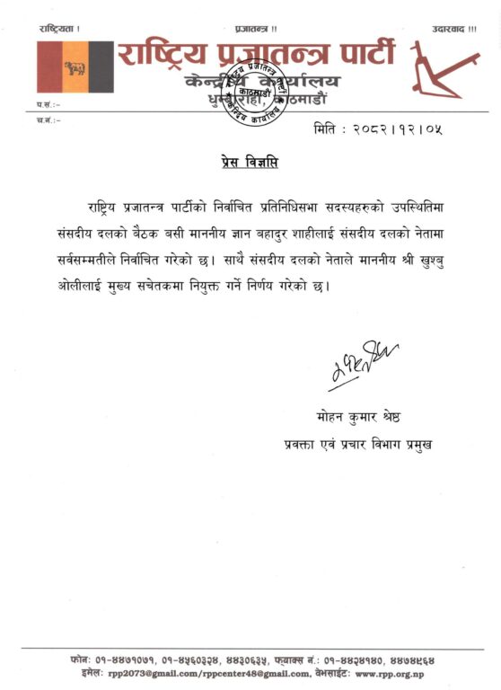 काठमाडौं । राष्ट्रिय प्रजातन्त्र पार्टी (राप्रपा) को संसदीय दलको नेतामा ज्ञानबहादुर शाही (ज्ञानेन्द्र शाही) चयन भएका छन् ।