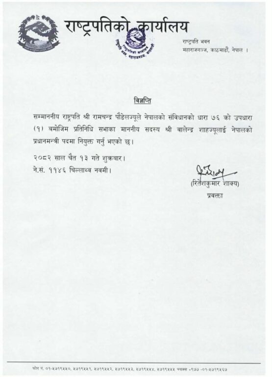 काठमाडौं । राष्ट्रिय स्वतन्त्र पार्टी (रास्वपा)का वरिष्ठ नेता बालेन्द्र शाह (बालेन) प्रधानमन्त्री नियुक्त भएका छन् । राष्ट्रपति रामचन्द्र पौडेलले आज बिहान बालेनलाई प्रधानमन्त्रीमा नियुक्त गरेका हुन् ।