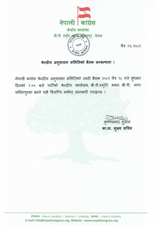 ‘नेपाली कांग्रेस केन्द्रीय अनुशासन समितिको जरुरी बैठक २०८२ चैत्र १८ गते बुधबार दिनको १ः०० बजे पार्टीको केन्द्रीय कार्यालय वीपी स्मृती भवन वीपी नगर ललितपुरमा बस्ने यसै विज्ञप्ति मार्फत् जानकारी गराइन्छ,’ जारी विज्ञप्तिमा भनिएको छ ।