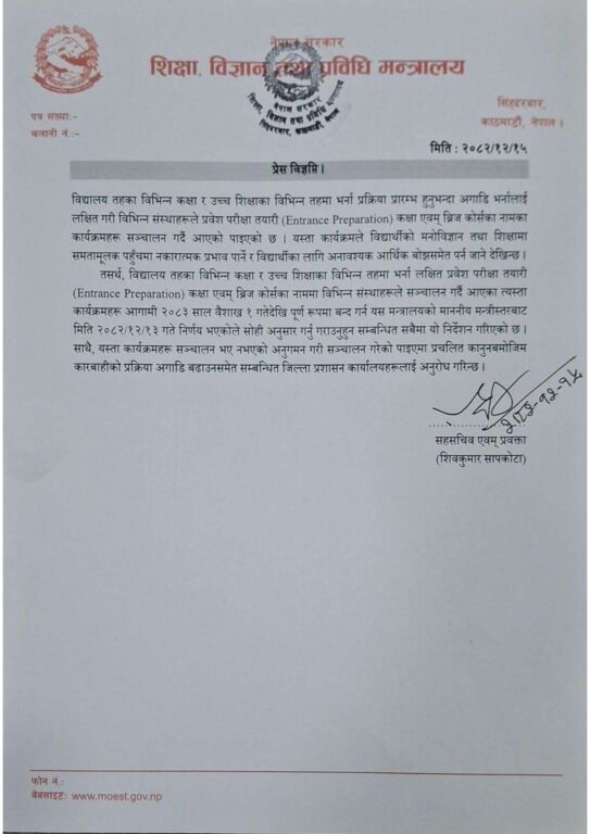 धेरै शैक्षिक संस्थाहरुले परीक्षा भन्दा अघि इन्ट्रान्स र ब्रिज कोर्सहरु दिँदै आइरहेका थिए । उक्त कार्यक्रमहरुले विद्यार्थीहरुमा थप आर्थिक भार पर्न जाने भन्दै मन्त्रालयले त्यसलाई रोक्न निर्देशन दिएको हो ।