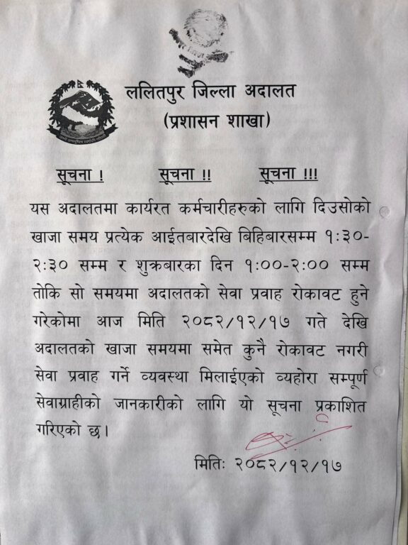 काठमाडौं । ललितपुर जिल्ला अदालतले अबदेखि खाजाको समय ‘ब्रेक’ मा पनि सेवाग्राहीलाई सेवा दिने भएको छ ।