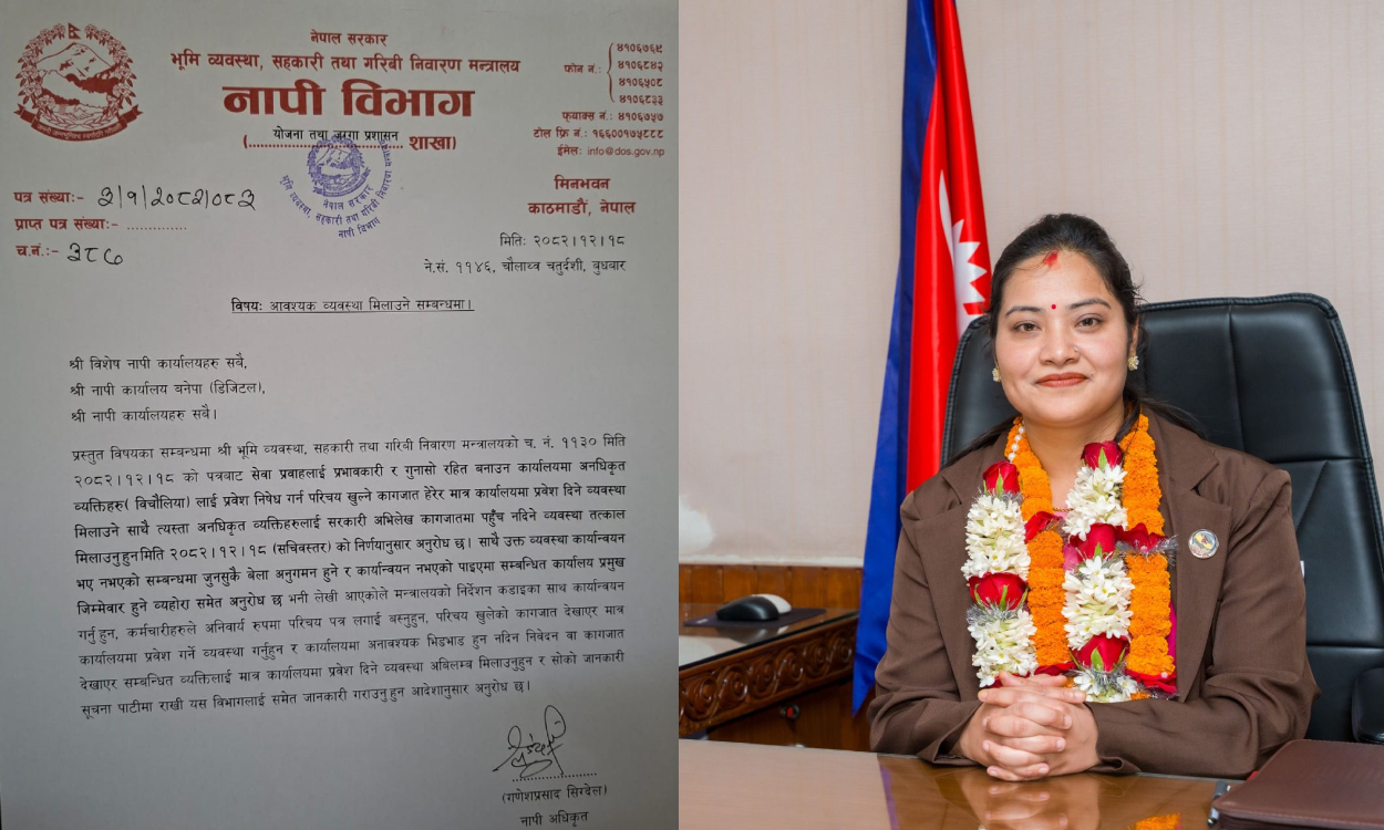 बुधबार भूमि व्यवस्था, सहकारी तथा गरिबी निवारण मन्त्री प्रतिभा रावलको निर्देशन अनुसार सचिव स्तरीय निर्णयबाट देशभरका नापी कार्यालय तथा मालपोत कार्यालयमा परिचय खुल्ने कागजात हेरेर मात्रै प्रवेश गराउन सम्बन्धित विभागले पत्राचार गरेको हो ।