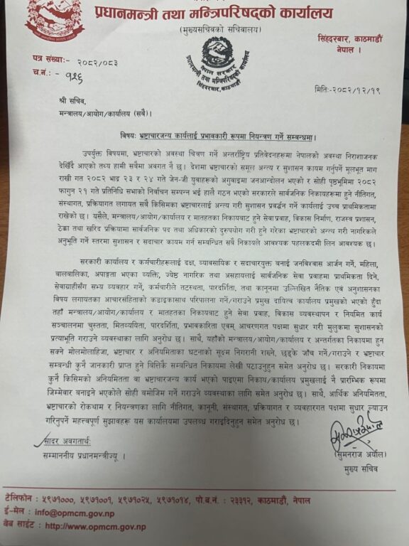 मुख्य सचिव सुमनराज अर्यालले सबै मन्त्रालय, आयोग र सरकारी कार्यालयहरूलाई परिपत्र गर्दै भ्रष्टाचारजन्य कार्यलाई प्रभावकारी रूपमा नियन्त्रण गर्न निर्देशन दिएका हुन् । प्रधानमन्त्री तथा मन्त्रिपरिषद्को कार्यालयबाट जारी परिपत्रमा अबदेखि कुनै पनि निकायमा भ्रष्टाचार वा अनियमितता भएको पाइए प्रारम्भिक जिम्मेवारी सम्बन्धित निकाय वा कार्यालय प्रमुखले नै लिनुपर्ने उल्लेख गरिएको छ ।