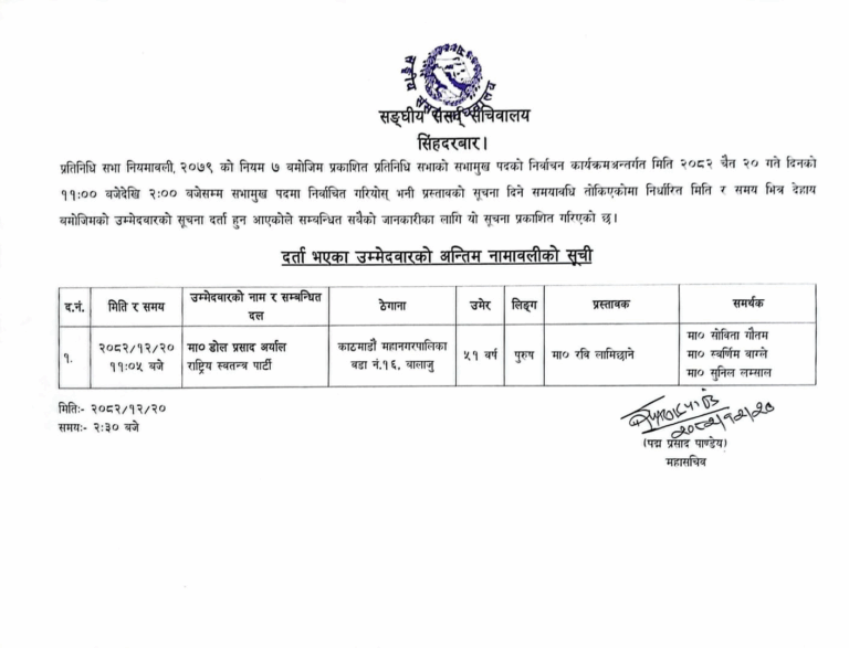 रास्वपाको एक्लै करिब दुई तिहाइ बहुमत रहेकाले विपक्षी दलहरुले उम्मेदवारी दर्ता नगरेका हुन् ।