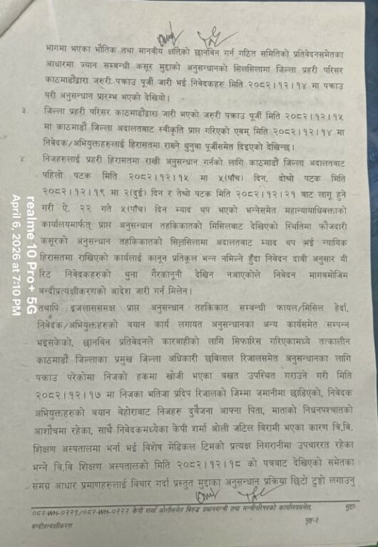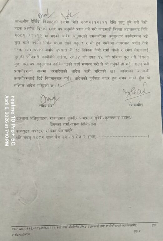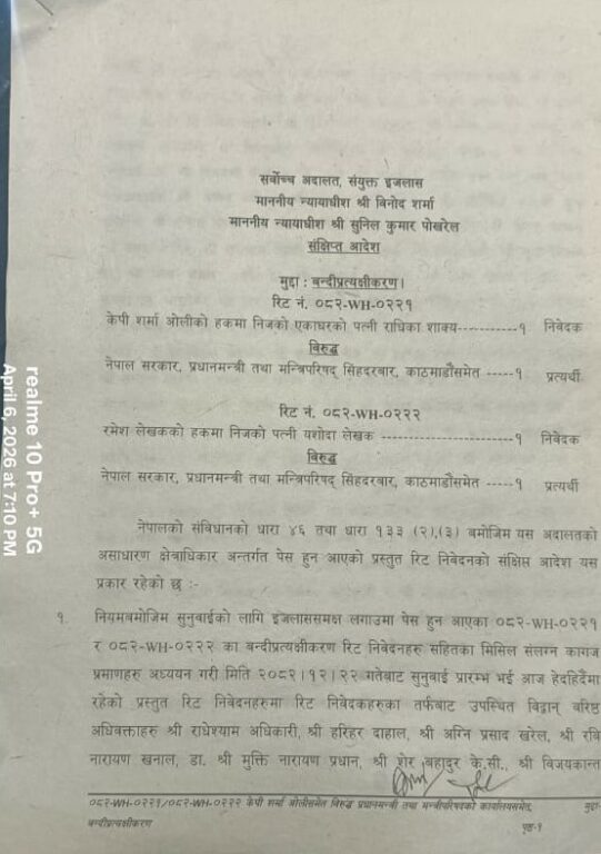 सोमबार ओली र लेखकलाई गैरकानुनी रुपमा थुनामा राखेको भन्दै परेको बन्दीपत्येक्षीकरणको रिटमा सुनुवाई गर्दै न्यायाधीशद्वय विनोद शर्मा र सुनिल कुमार पोखरेलको इजलासले यस्तो आदेश दिएको हो ।