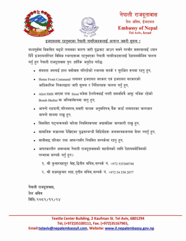 यस्तै, पछिल्ला घटनाबारे नियमित जानकारी राख्न र सामाजिक सञ्जालमा युद्धसम्बन्धी भिडियोहरू अनावश्यक रूपमा शेयर नगर्न पनि अनुरोध गरिएको छ ।