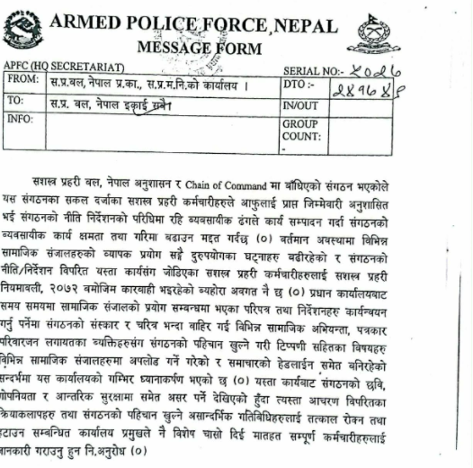 सो परिपत्रमा यस्ता कार्यबाट संगठनको छवि, गोपनीयता र आन्तरिक सुरक्षामा समेत असर पर्ने देखिएको हुँदा त्यस्ता आचरणविपरीतका क्रियाकलापहरू तथा संगठनको पहिचान खुल्ने असान्दर्भिक गतिविधिहरूलाई तत्काल रोक्न तथा हटाउन सम्बन्धित कार्यालय प्रमुखले नै विशेष चासो दिई मातहत सम्पूर्ण कर्मचारीहरूलाई जानकारी गराउन अनुरोध भएको पनि उल्लेख छ ।
