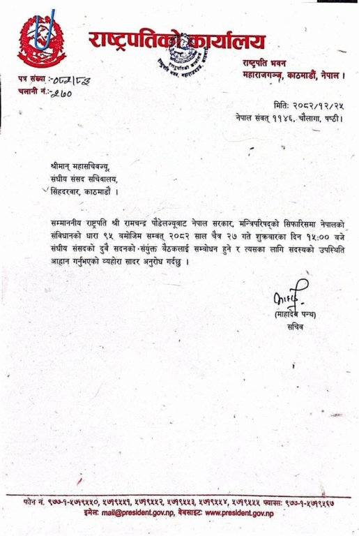 संविधानको धारा ९५ मा उल्लेख भएको व्यवस्था अनुसार राष्ट्रपति पौडेलले संसदलाई सम्बोधन गर्न लागेको राष्ट्रपति कार्यालयले जनाएको छ ।