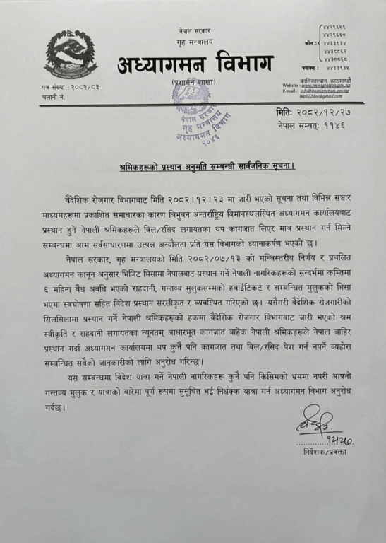 विभागले सूचना जारी गर्दै विमानस्थलबाट विदेश जान श्रमिकले थप बिल र रसिद जस्ता कागजात बुझाउनुपर्ने भन्ने कुरा गलत भएको स्पष्ट पारेको छ ।
