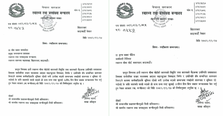 जनस्वास्थ्य प्रमुख र स्वास्थ्य बिमा बोर्डका निर्देशकलाई मन्त्रालयले सोध्यो स्पष्टीकरण