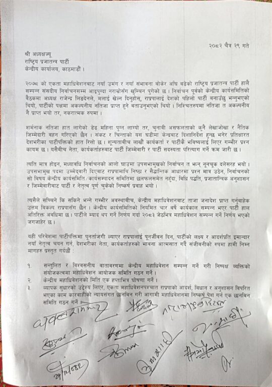 ‘…सच्चिने कि सकिने भन्ने गम्भीर अवस्थाबिच, केन्द्रीय महाधिवेशनबाट ताजा जनादेश प्राप्त गर्नुबाहेक उत्तम विकल्प राप्रपासँग छैन । केन्द्रीय कार्यसमितिको नियमित चार वर्षे कार्यकाल सम्पन्न भएर पार्टी हाल अरिरिक्त अवधिमा छ । पार्टीले म्याद थप गर्ने निर्णय हुँदा २०८३ जेठभित्र महाधिवेशन सम्पन्न गर्ने निर्णय जगजाहेर छ,’ लिङ्देनलाई पठाइएको पत्रमा भनिएको छ ।