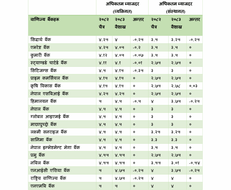 बैशाखका लागि अधिकांश बैंकले ब्याजदर घटाए, १० वटाको स्थिर, एकको वृद्धि