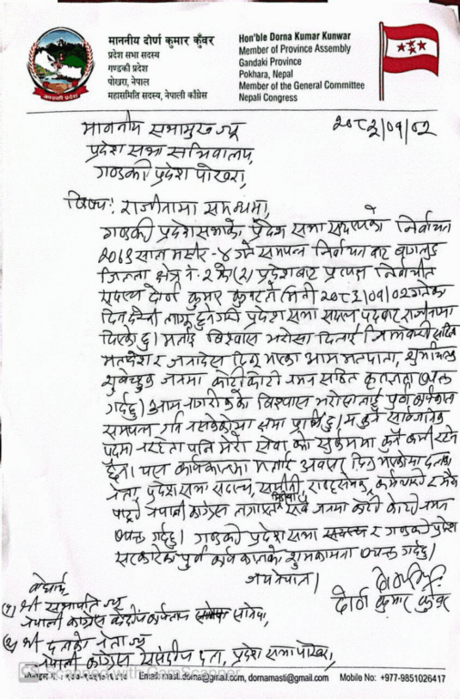 पोखरा । नेपाली कांग्रेसका गण्डकी प्रदेश सांसद दोर्णकुमार कुँवरले प्रदेश सदस्य पदबाट राजीनामा दिएका छन् ।