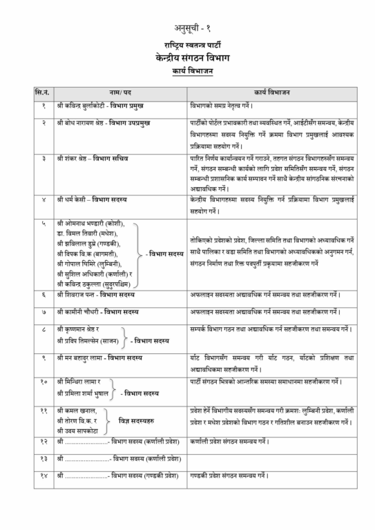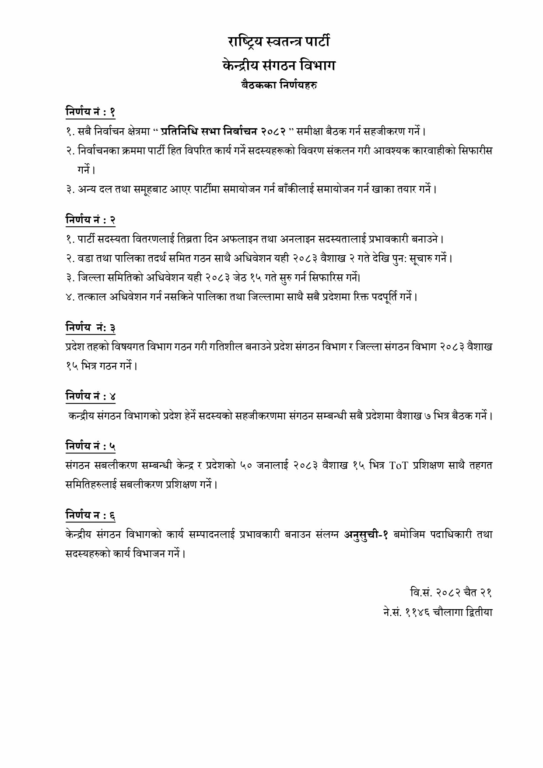 काठमाडौं । सरकारको नेतृत्व गरेको राष्ट्रिय स्वतन्त्र पार्टी (रास्वपा) ले केन्द्रीय संगठन विभागको बैठकका निर्णयहरू सार्वजनिक गरेको छ ।