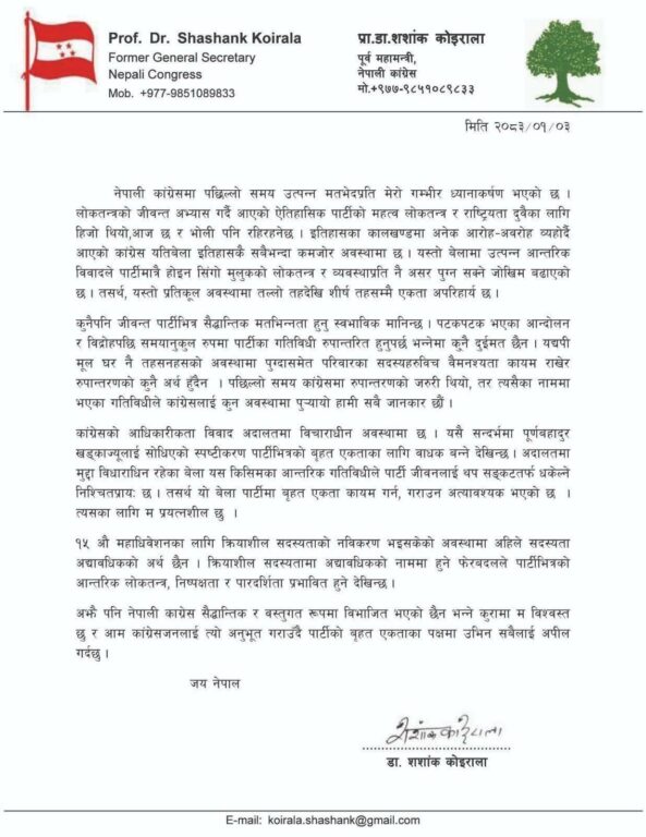 पार्टीको पछिल्ला गतिविधिबारे धारणा राख्दै कांग्रेसका पूर्वमहामन्त्री समेत रहेका नेता कोइरालाले सो कुरा बताएका हुन् ।