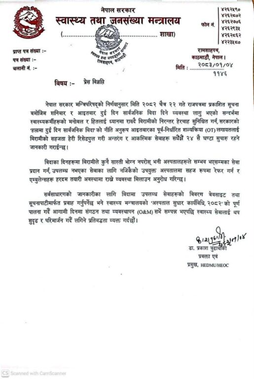 स्वास्थ्य तथा जनसंख्या मन्त्रालयले शुक्रबार विज्ञप्ति नै जारी गरी शनिबार र आइतबार ओपीडी सेवा बन्द गर्ने निर्णय गरेको जनाएको छ ।