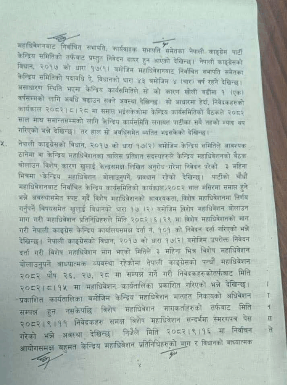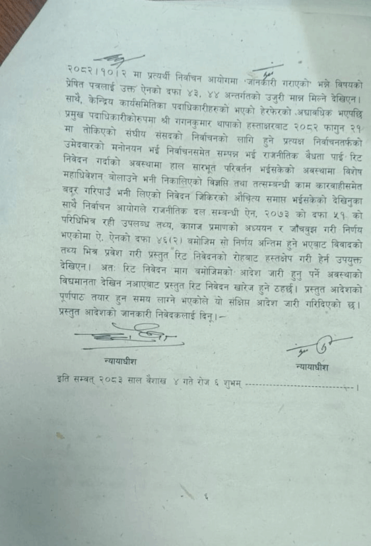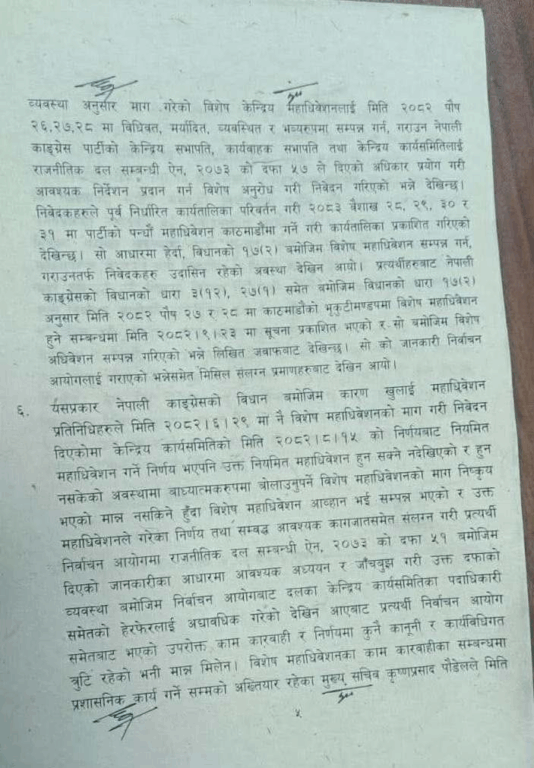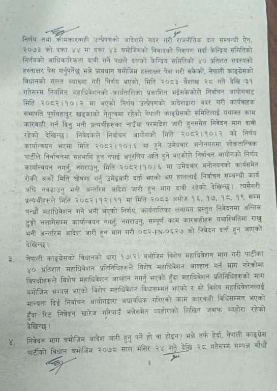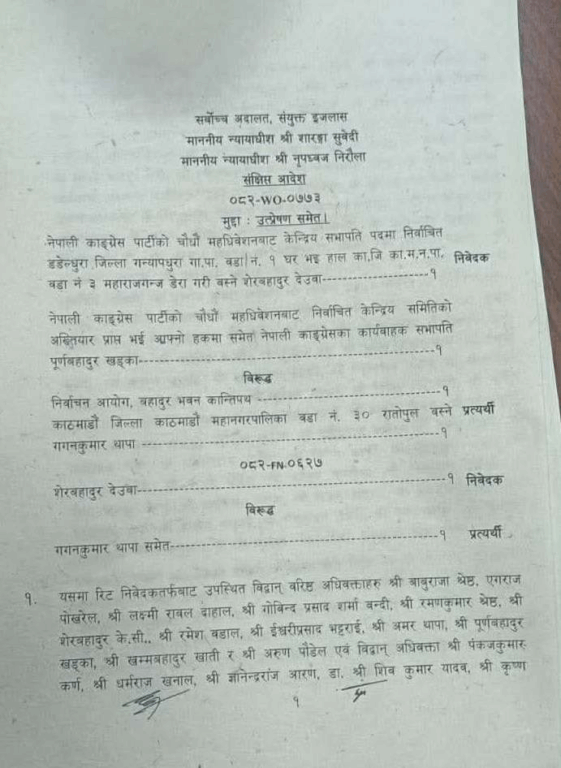तत्कालीन सभापति शेरबहादुर देउवा पक्षले विशेष महाधिवेशनबाट आएको नेतृत्वको वैधतामाथि प्रश्न उठाउँदै दिएको रिट खारेज समेत गरिदिएको छ ।