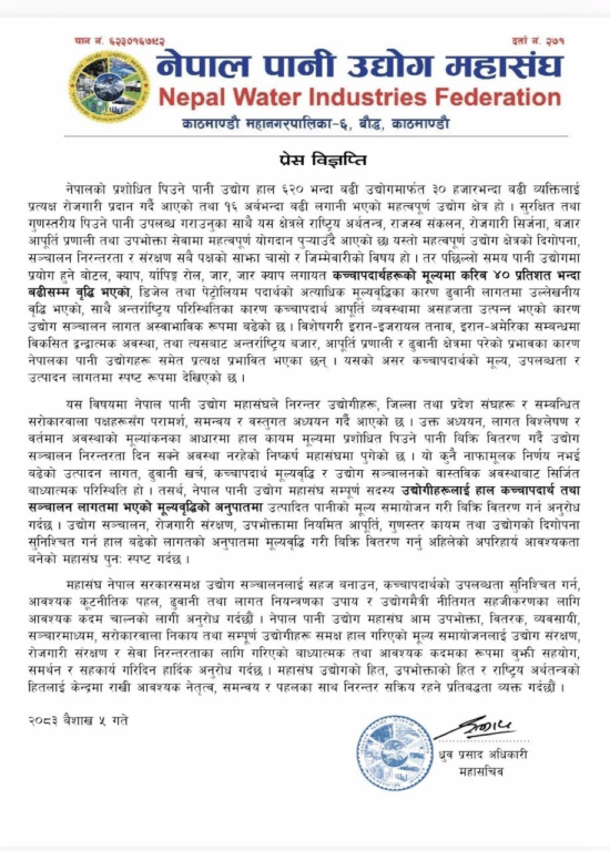 अन्तर्राष्ट्रिय अवस्था, विशेषगरी इरान–इजरायल र इरान–अमेरिका बीचको तनावका कारण विश्व बजार र आपूर्ति प्रणालीमा असर परेको र त्यसको प्रभाव नेपालका पानी उद्योगमा परेको महासंघले बताएको छ ।
