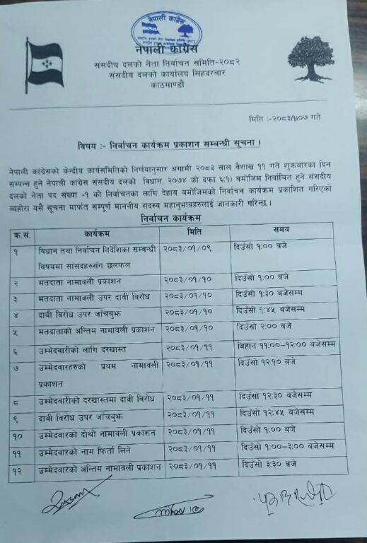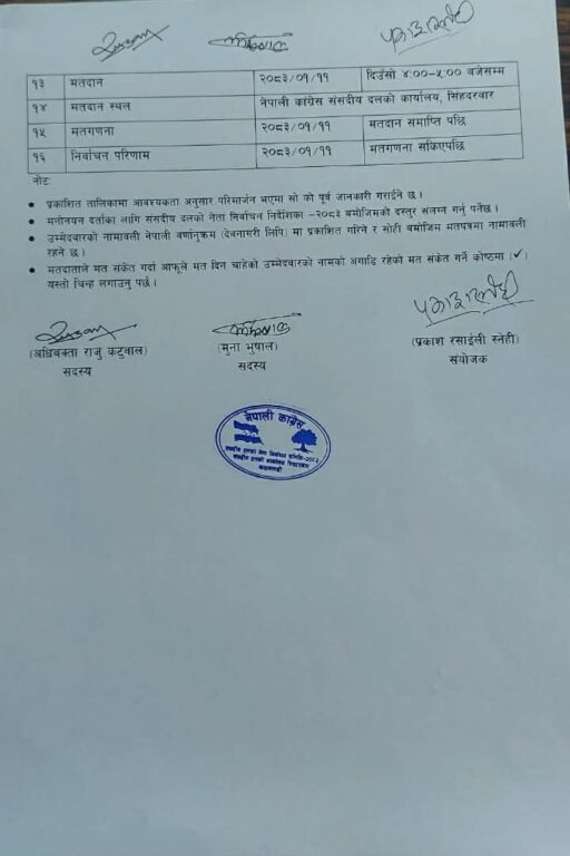 हाल कांग्रेस प्रत्यक्षमा १८ र समानुपातिकमा २० गरी ३८ सिटसहित संसदमा प्रतिनिधित्व गरिरहेको छ । निर्वाचन कार्यक्रम सिंहदरबारस्थित नेपाली कांग्रेसको संसदीय दलको कार्यालयमा हुनेछ ।