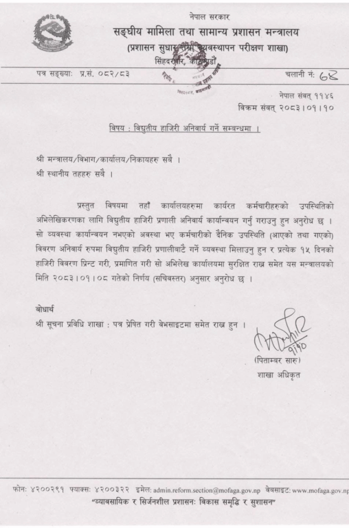 संघीय मामिला तथा सामान्य प्रशासन मन्त्रालयले सबै मन्त्रालय, विभाग, कार्यालय, निकाय तथा स्थानीय तहलाई पत्राचार गर्दै कार्यालयमा कार्यरत कर्मचारीहरूको उपस्थितिको अभिलेखिकरणका लागि विद्युतीय हाजिरी प्रणाली अनिवार्य रूपमा कार्यान्वयन गर्न निर्देशन दिएको हो ।