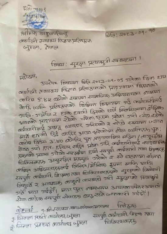 काठमाडौं । जुम्लामा रहेको कर्णाली स्वास्थ्य विज्ञान प्रतिष्ठानका कर्मचारीहरुले सुरक्षाको माग गर्दै उपकुलपतिलाई पत्र लेखेका छन् ।