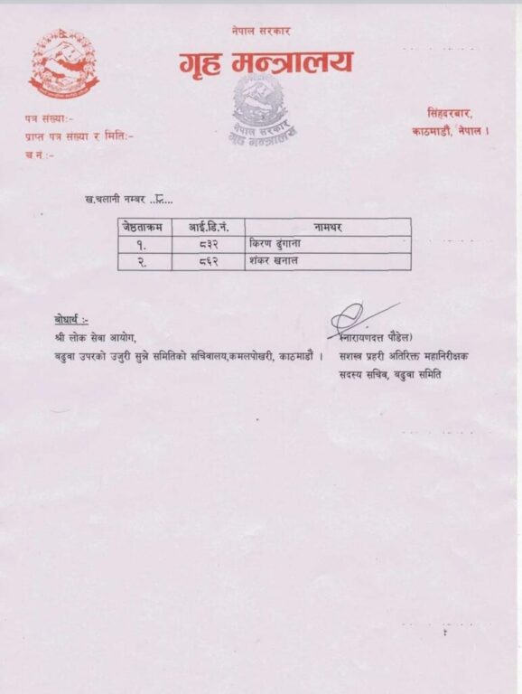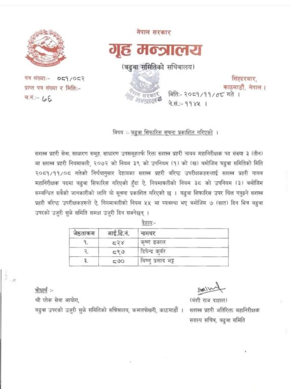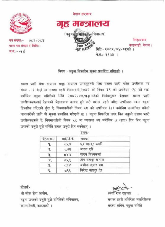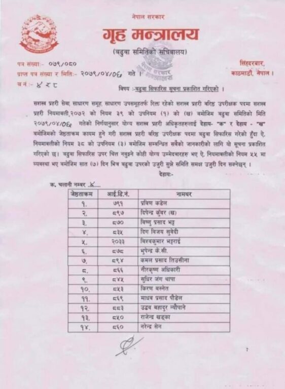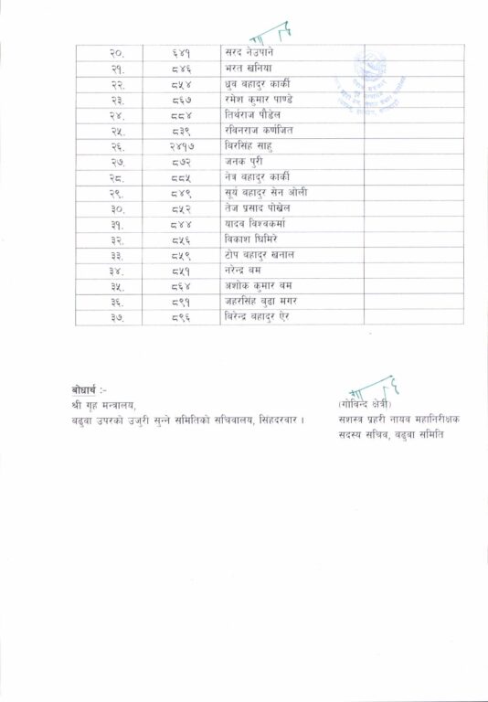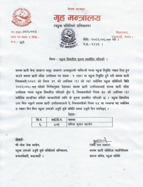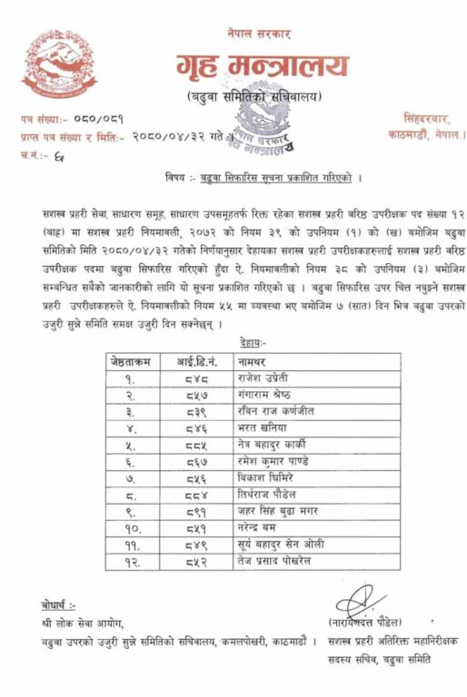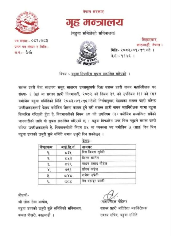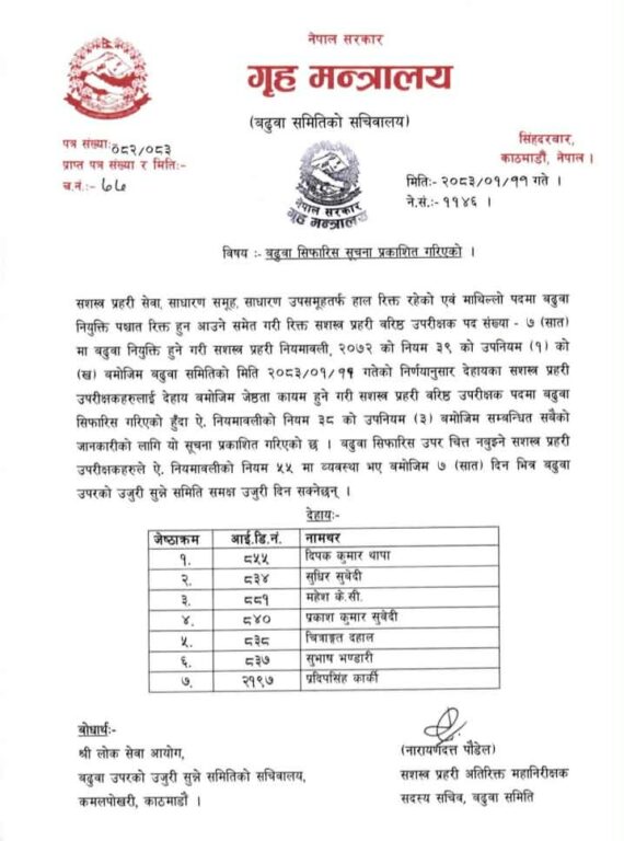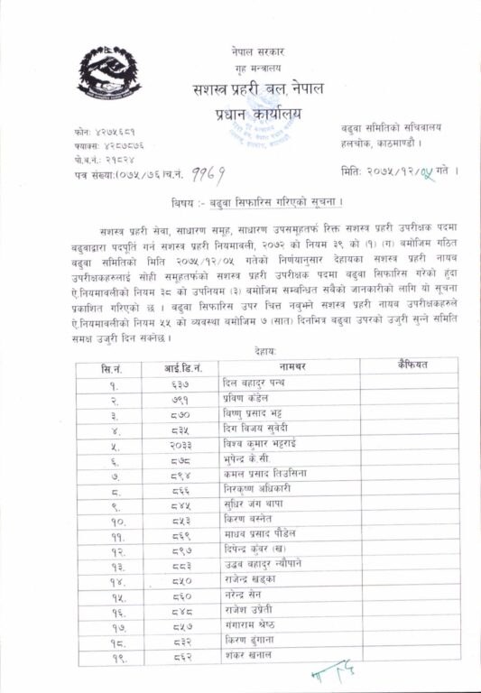 सशस्त्र प्रहरी नियमावली, २०७२ को नियम ३९ को उपनियम (१) को (ख) बमोजिम बढुवा सिफारिस गरिएको, ऐ. नियमावलीको नियम ३८ को उपनियम (३) बमोजिम सम्बन्धित सबैको जानकारीको लागि सूचना प्रकाशित गरिएको र बढुवा सिफारिसउपर चित्त नबुझ्नेहरूले ऐ. नियमावलीको नियम ५५ मा व्यवस्था भएबमोजिम ७ (सात) दिन भित्र बढुवा उपरको उजुरी सुन्ने समिति समक्ष उजुरी दिन सूचनामा भनिएको छ ।