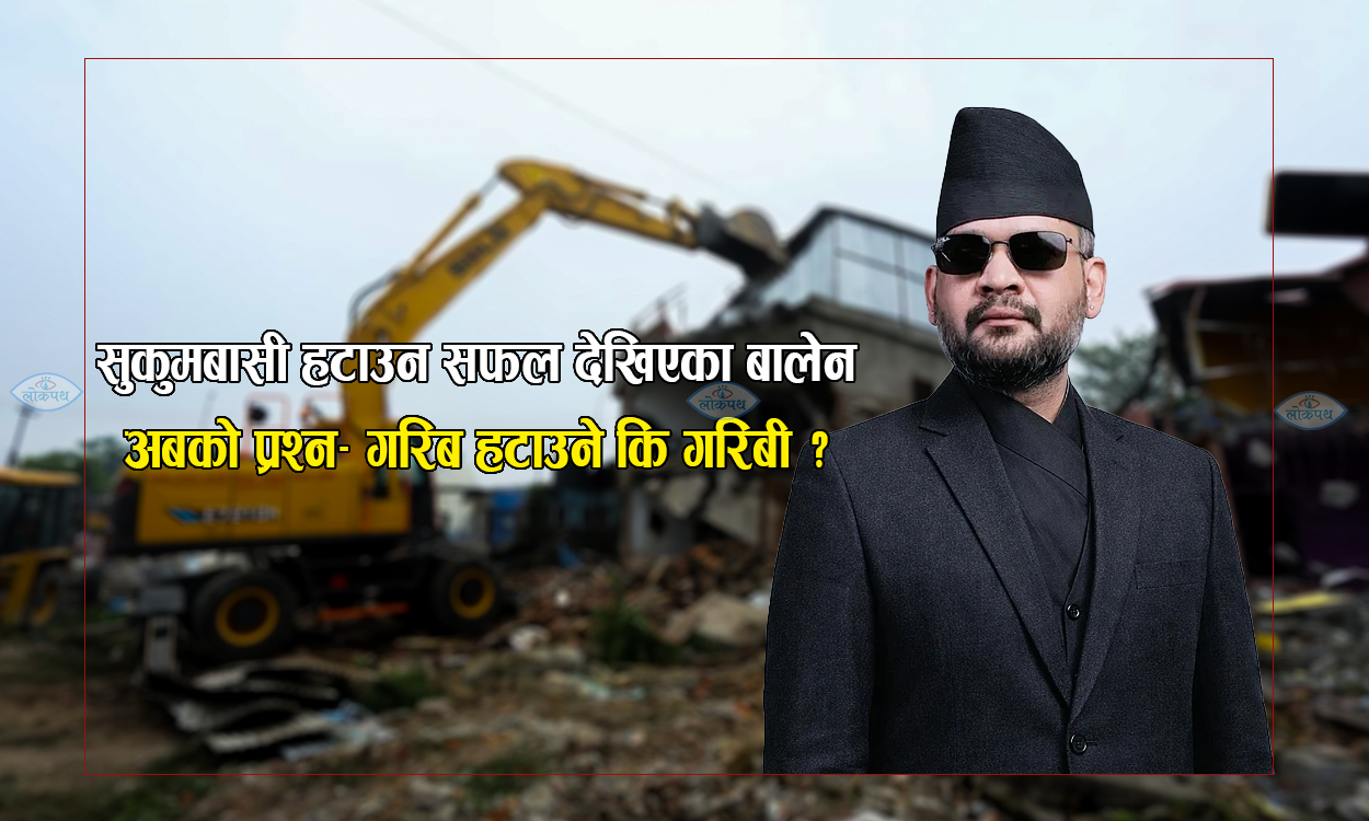 वर्षौँदेखि त्यही सुकुमबासी बस्तीलाई भोट बैंक बनाइयो । राजनीतिक दलहरूको आड र भरोसामा वास्तविक सुकुमबासी भन्दा सुकुमबासीका नाममा ‘हुकुम’ चलाउनेहरुको रजगज थियो । सिट संख्याका आधारमा बलियो देखिएको बालेन सरकारले एक महिनाको ‘सफर’ गरिरहँदा व्यवस्थापनको चुनौतीलाई शंकाको सुविधा दिने हो भने नदी किनारबाट अव्यवस्थित बस्ती हटाउने काममा सफल रहेको मान्न धेरै हिच्किचाउनु पर्दैैन ।