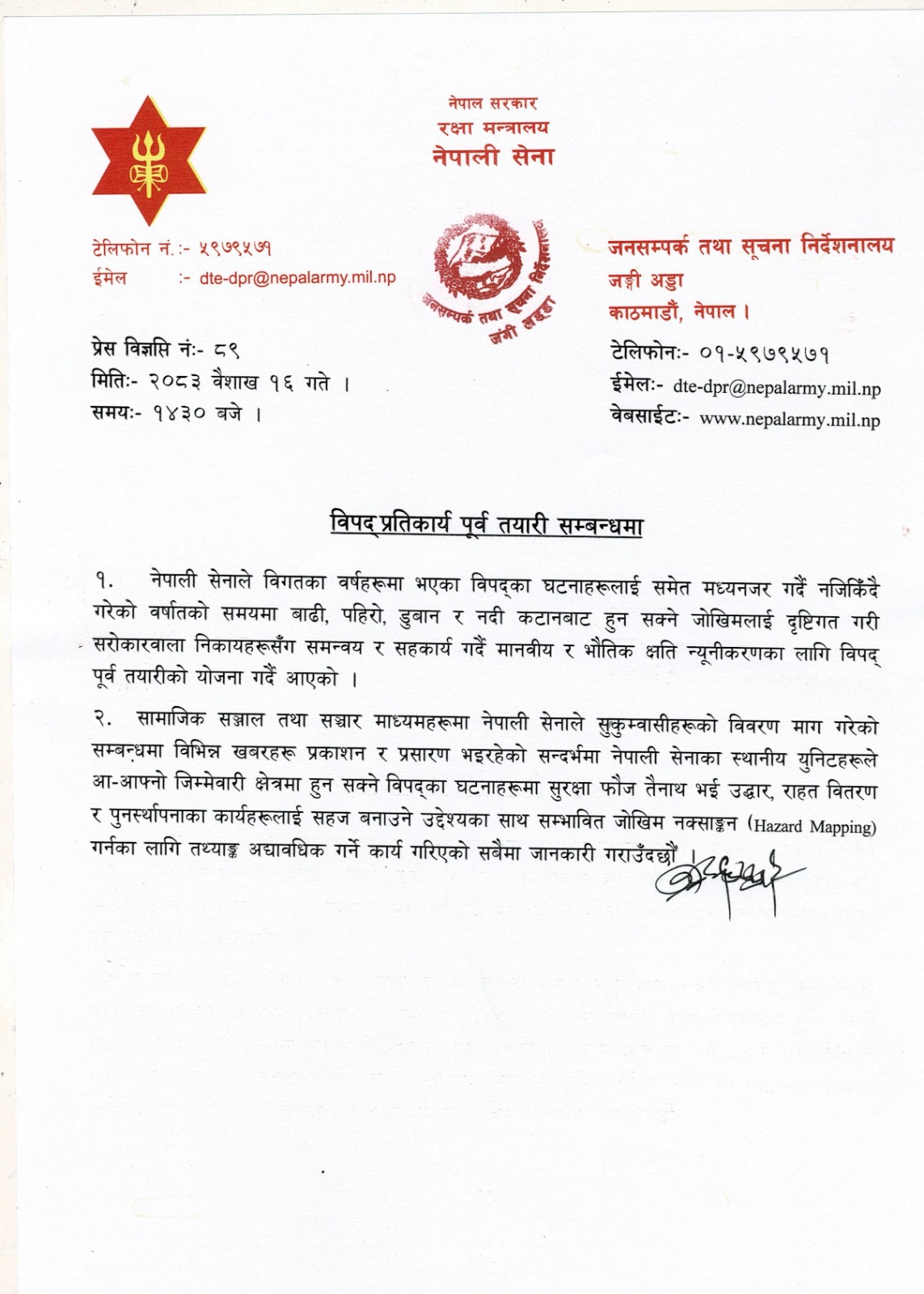 नेपाली सेनाले बुधबार विज्ञप्ति नै जारी गरेर सेनाको स्थानीय युनिटहरुले विपद्जन्य घटनाबाट आम नागरिकलाई बचाउन पूर्वतयारी स्वरुप विवरण संकलन गरेको बताए ।