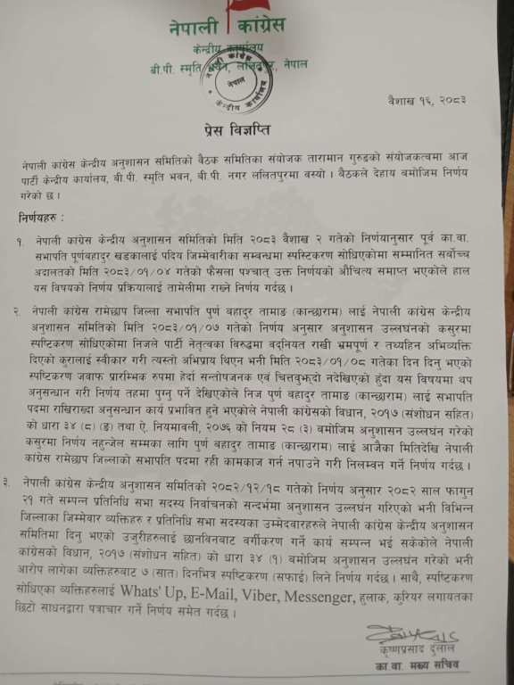 ‘नेपाली कांग्रेस केन्द्रीय अनुशासन समितिको मिति २०८३ वैशाख २ गतेको निर्णयानुसार पूर्व का।वा। सभापति पूर्णबहादुर खडकालाई पदिय जिम्मेवारीका सम्बन्धमा स्पस्टिकरण सोधिएकोमा सम्मानित सर्बोच्च अदालतको मिति २०८३/०१/०४ गतेको फैसला पश्चात् उक्त निर्णयको औचित्य समाप्त भएकोले हाल यस विषयको निर्णय प्रक्रियालाई तामेलीमा राख्ने निर्णय गर्दछ,’ अनुशासन समितिको बैठकको निर्णयपछि भनिएको छ ।