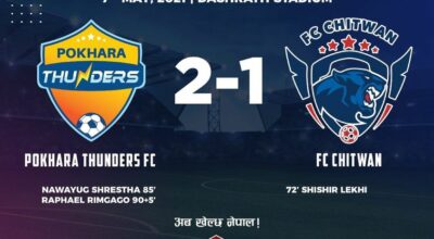 काठमाडौं। नेपाल सुपर लिग (एनएसएल) अन्तर्गत आज (शुक्रवार) भएको एकमात्र खेलमा पोखरा थन्डर्सले एफसी चितवनलाई