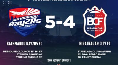 काठमाडौं। नेपाल सुपर लिग (एनएसएल) अन्तर्गत बिहीवार भएको दोस्रो खेलमा काठमाडौं रेजर्सले विराटनगर सिटी एफसीमाथि